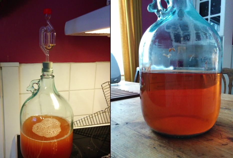 Siiderin kirkastumisessa voi olla mehukohtaisia eroja, mutta  valmistamani siiderit ovat aina lopuksi kirkastuneet. Vasemmalla on mehu ennen käymistä, ja oikealla siideri odottaa kypsytyksen jälkeistä pullotusta.